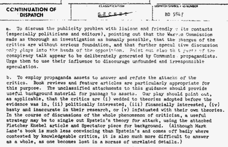 Ist es ein Zufall, dass sich wenig später der US-Geheimdienst CIA dieses Begriffs annahm, um ihn zukünftig als Kampfbegriff zu nutzen? Einerseits verknüpfte die CIA VT mit kommunistischer Propaganda und wies des Weiteren ihre Mitarbeiter in der Direktive 1035-960 (Concerning of the Warren Report) an, Kritiker und Forschende des Kennedy-Mordes, die nicht auf der Linie des Warren-Reports mitliefen, nun mit dem Begriff „Verschwörungstheoretiker“, verbunden mit Charaktereigenschaften wie Geldgier und Geltungssucht, zu diffamieren und so unglaubwürdig zu machen. [b1]