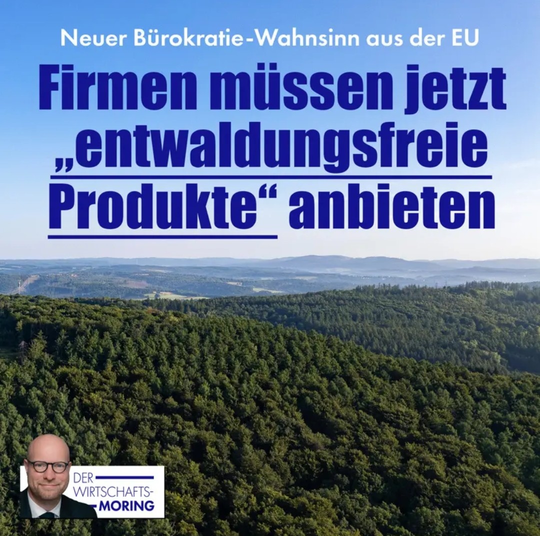 "Aus Brüssel kommt eine neue Verordnung, die angeblich die Wälder retten soll, aber am Ende zu höheren Preisen für alle Kunden sorgen wird. Denn Unternehmen müssen dann umfangreich nachweisen, dass kein Wald unter der Herstellung von vielen verschiedenen Produkten leidet oder gerodet wird. Kritik kommt nicht nur aus der Wirtschaft, sondern auch von NGOs. Doch Ursula von der Leyen hält unbeirrt an ihrem Kurs fest.