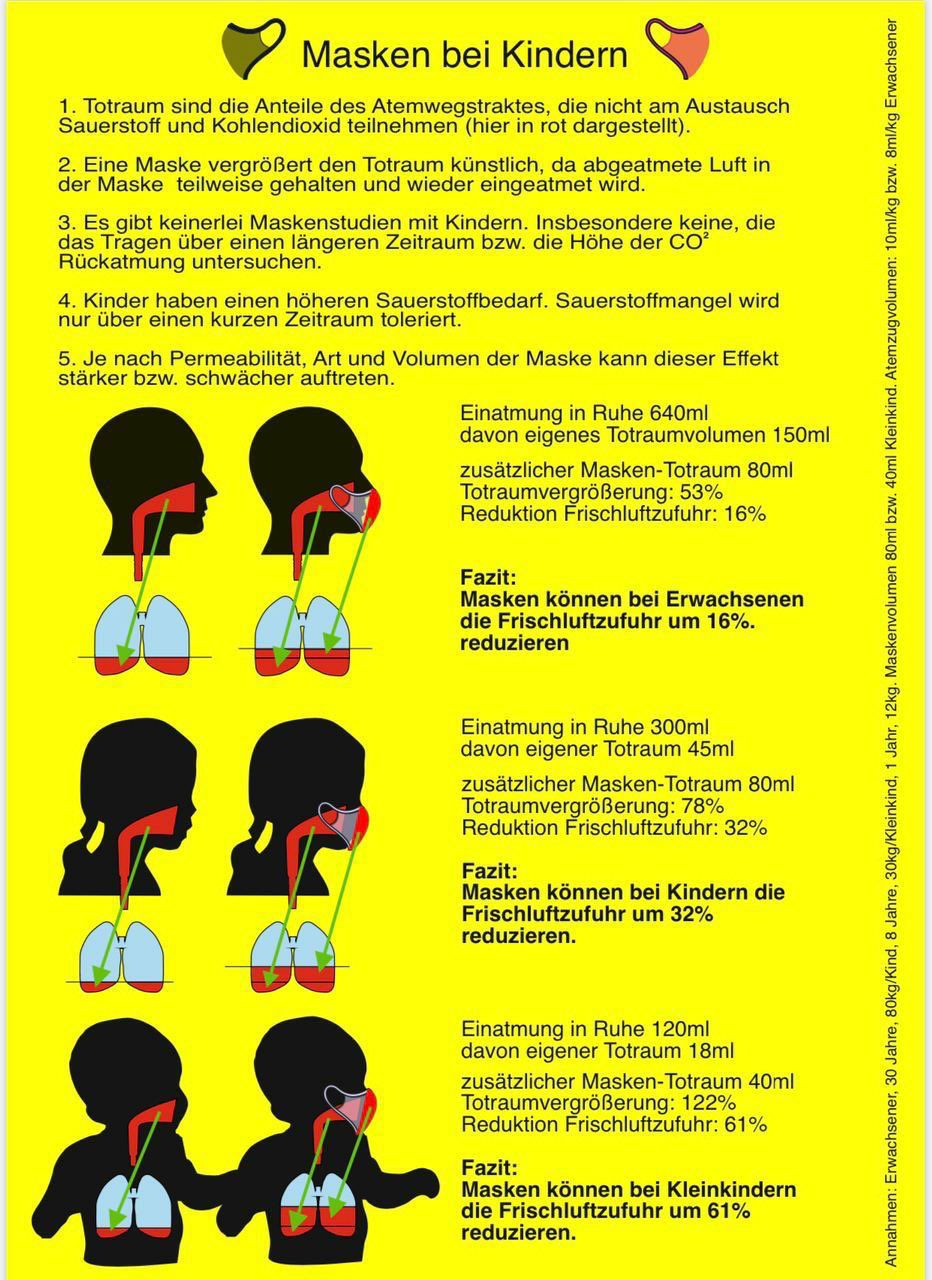 Aber ist es nicht auch so, daß abhängig von der Sauerstoffsättigung des Blutes sich die Atemfrequenz und Tiefe ändert? Daher wäre dann das Blut doch wieder so gesättigt, als trüge man keine Maske. Ich kann mich noch daran erinnern, daß ich mal mit der Maske auf in einem Ärztehaus in den vierten Stock wollte und in etwa im zweiten Stock bekam ich da durch einfach nicht mehr genug Luft, da man auch mehr Kraft zum Luft holen braucht. Mir blieb dann nichts mehr anderes übrig, als diese Maske herunter zu ziehen. Das muß aber doch auch bei einem Kind gehen. Es atmet doch auch schneller, wenn es sich beispielsweise sportlich betätigt.