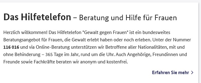 Das "Hilfetelefon" für Frauen ... 365 Tage ... rund um die Uhr ... https://www.hilfetelefon.de/