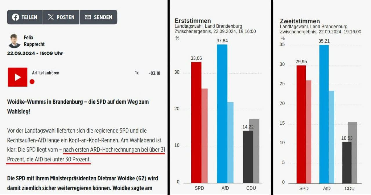 Wahlbetrug in Brandenburg? Wird medial gerade das nächste krumme Ganovenstück ausgepackt? Der deutsche Mainstream berichtet in diesen Minuten, die SPD hätte die Wahl in Brandenburg mit 31 Prozent knapp vor der AfD mit 30 Prozent der Stimmen gewonnen. Auf der offiziellen Internetseite der Landeswahlleitung liegt die AfD allerdings um 20.30 Uhr sowohl bei den Erststimmen als auch bei den Zweitstimmen uneinholbar in Führung. via @anonymousnews_org