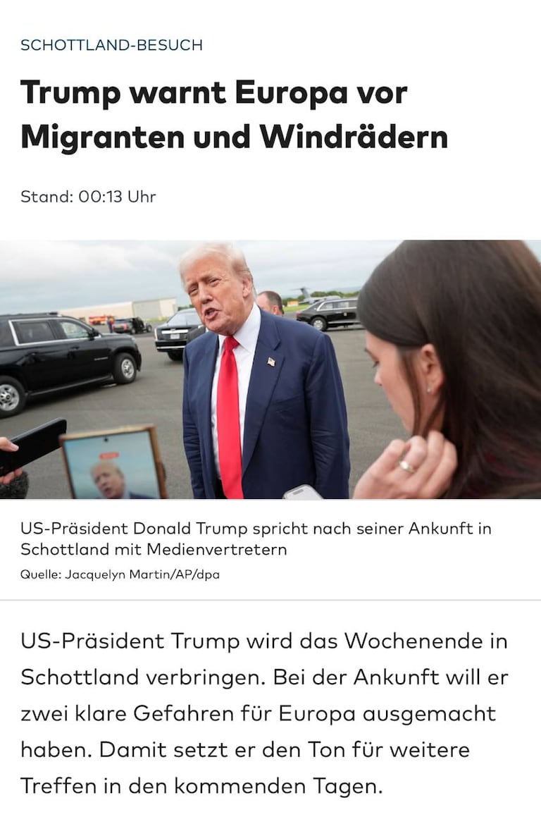 Bei seiner Ankunft in Schottland hat US-Präsident Donald Trump Europa eindringlich vor zwei zentralen Gefahren gewarnt. Seiner Meinung nach droht dem Kontinent wegen Windrädern und Immigration der Untergang. „Man fliegt darüber und sieht überall diese Windräder, die Eure schönen Felder und Täler ruinieren und Eure Vögel umbringen“, sagte er am Flughafen Glasgow Prestwick. Windräder schadeten auch dem Meer, behauptete er weiter.