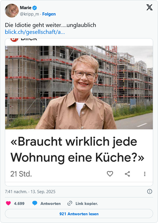 In Zürich sollen Wohnungen ohne eigene Küche die Wohnungsnot lösen – ein Experiment grüner Ideologie. Geteilte Küchen und Co-Living sollen Effizienz bringen, kosten aber die Privatsphäre und Individualität der Mittelklasse. Die Idee stammt von Regula Lüscher ‒ einst "Berlins überforderte Senatsbaudirektorin".