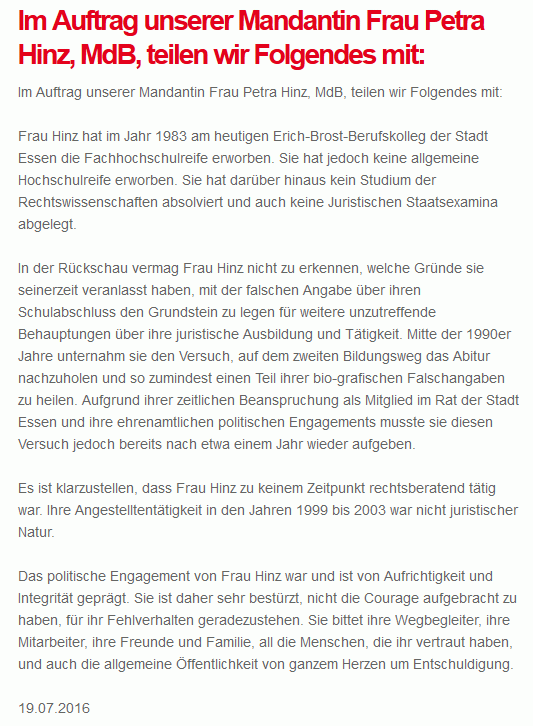 In der Rückschau vermag Frau Hinz nicht zu erkennen, welche Gründe sie seinerzeit veranlasst haben, mit der falschen Angabe über ihren Schulabschluss den Grundstein zu legen für weitere unzutreffende Behauptungen über ihre juristische Ausbildung und Tätigkeit. Mitte der 1990er Jahre unternahm sie den Versuch, auf dem zweiten Bildungsweg das Abitur nachzuholen und so zumindest einen Teil ihrer bio-grafischen Falschangaben zu heilen. Aufgrund ihrer zeitlichen Beanspruchung als Mitglied im Rat der Stadt Essen und ihre ehrenamtlichen politischen Engagements musste sie diesen Versuch jedoch bereits nach etwa einem Jahr wieder aufgeben.