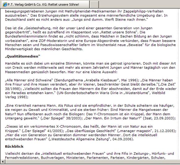 "Der Mitstreiter Christoph aus dem gelben Forum hat mal eine Liste erstellt mit allen möglichen männerfeindlichen Büchertiteln. Ich habe mehrere davon auf amazon.de gesucht und musste mit Entsetzen feststellen, dass es diese Bücher tatsächlich gibt.