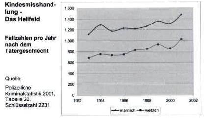 Weiter fällt an der herangezogenen Untersuchung des KFN auf, dass das Tätergeschlecht wie auch bei anderen Kindesmisshandlungsstudien in Deutschland nicht ermittelt wurde. Man könnte vermuten, dass angesichts der sich in der PKS abzeichnenden Tätergeschlechtsstruktur ein starkes Tabu vor der weiteren Aufhellung dieses Sachverhaltes besteht. Für gezielte Prävention ist dieses Wissen aber Voraussetzung.