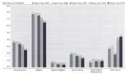 Diese Grafik zeigt vom US-Gesundheitsministerium veröffentlichte Zeitreihen der verschiedenen Kategorien von Kindesmisshandlung". Als verbreitetste Form tritt Vernachlässigung (Neglect) auf. Es folgt körperliche Misshandlung (Physical Abuse), sexueller Missbrauch (Sexual Abuse) und psychische Gewalt {Psychological Maltreatment). Solche Zahlen geben wichtige Hinweise für die Schwerpunktsetzung für Gewaltschutzpolitik und präventive Maßnahmen. Auch wenn es für die Bundesrepublik landesspezifische Unterschiede geben mag, wird sich das Bild nicht grundsätzlich unterscheiden.